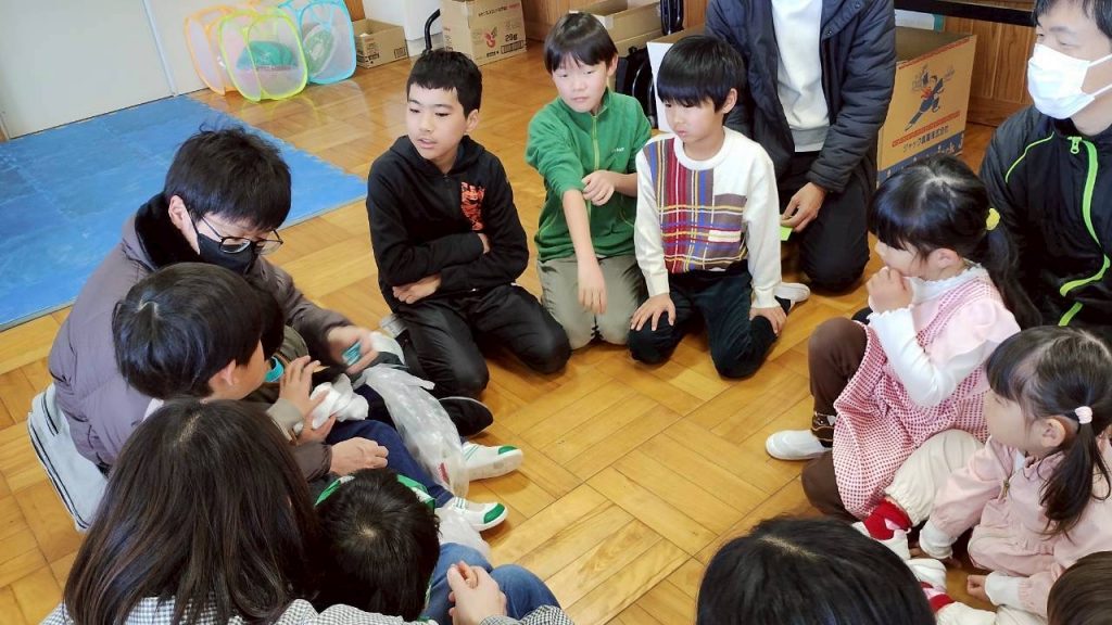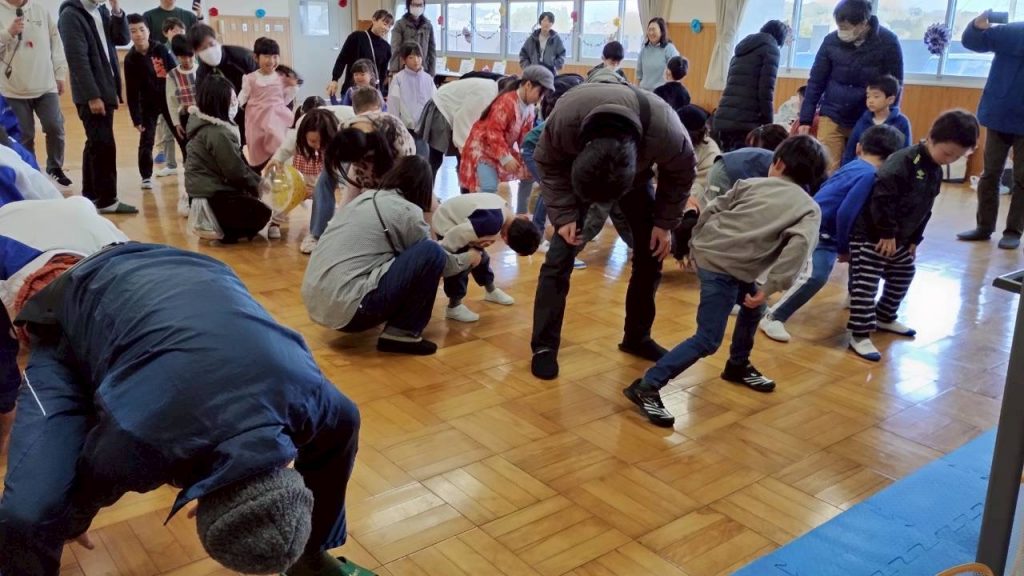 おたのしみ会は万歩計を振って数を競争するゲームや、ビーチボール送り、まるばつクイズなど