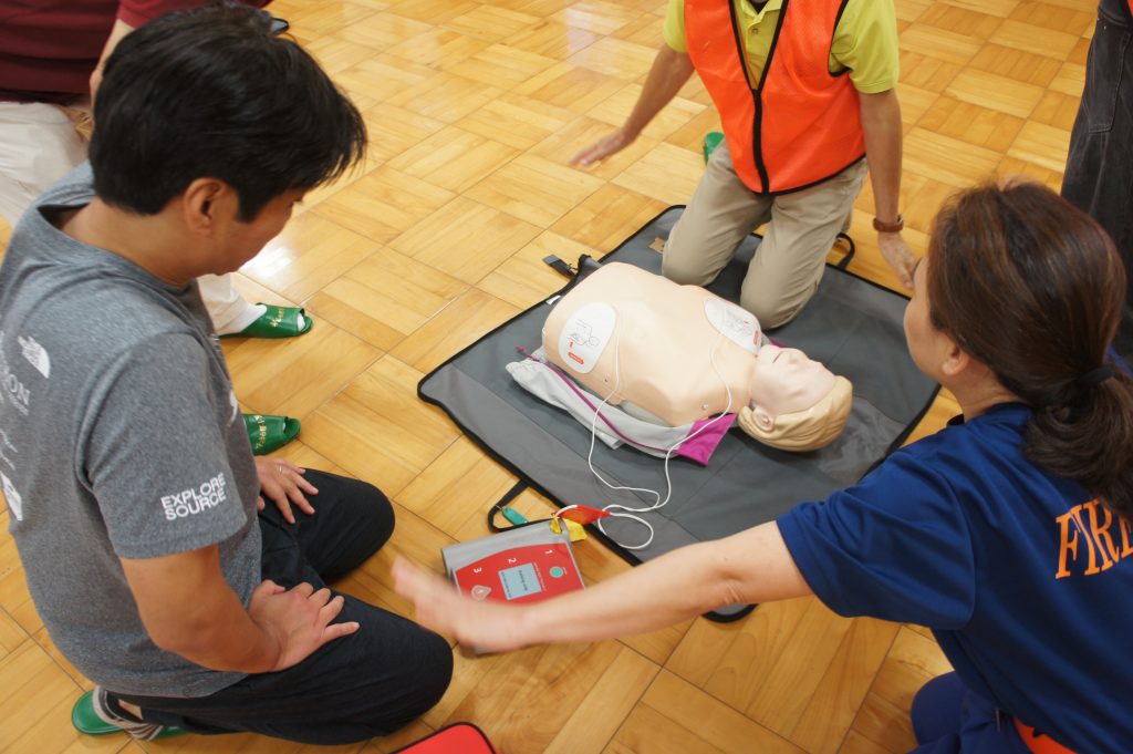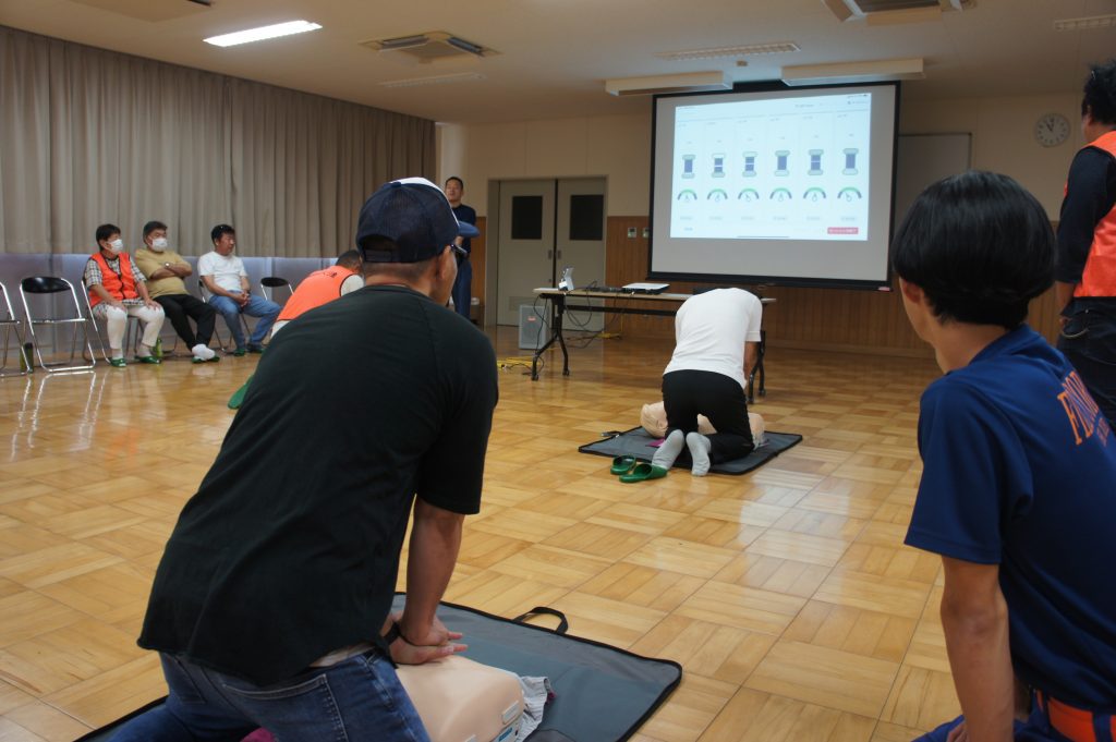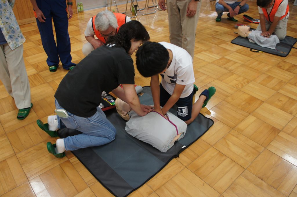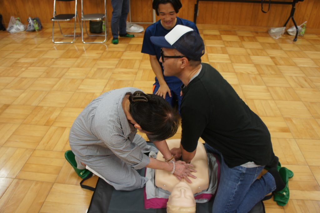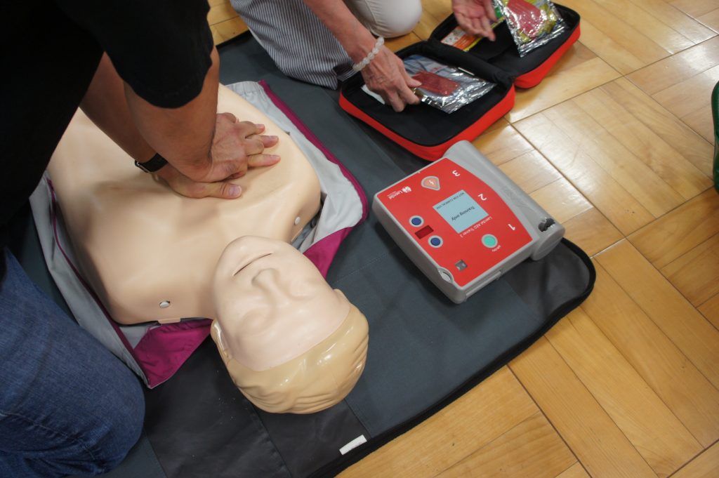実習では、AEDキットを用いた心肺蘇生の指導の後、参加者一人ひとりが人形を使って実践しました。