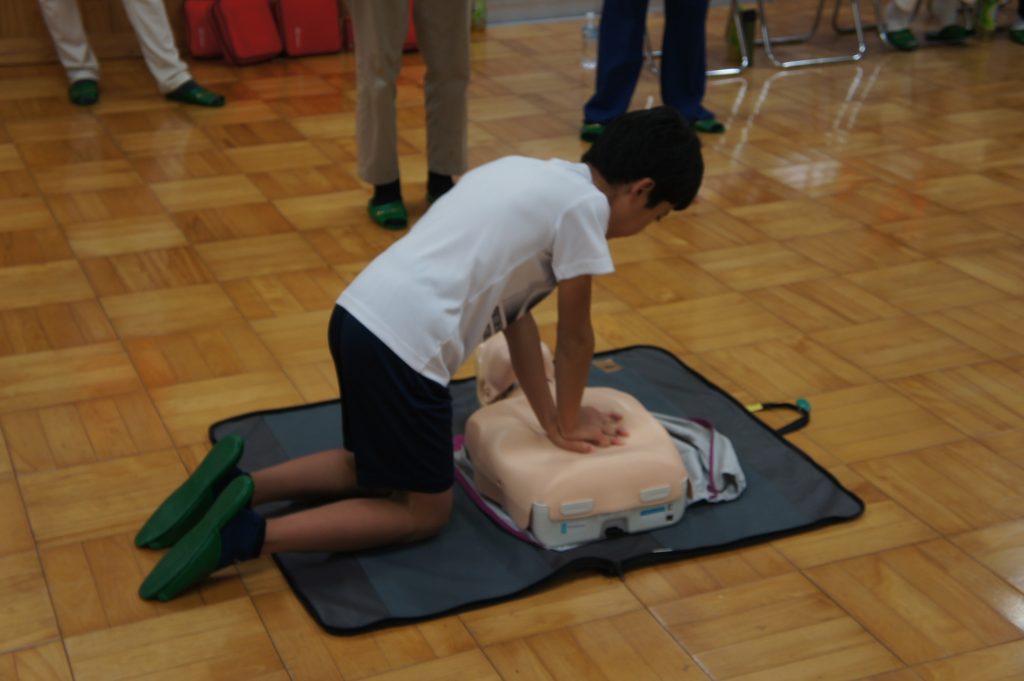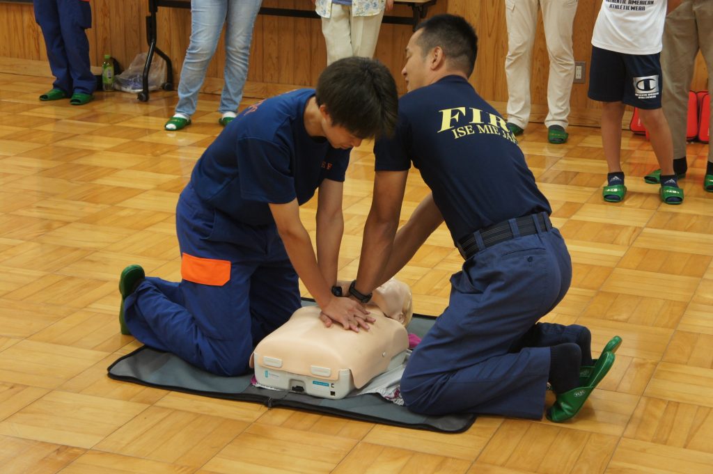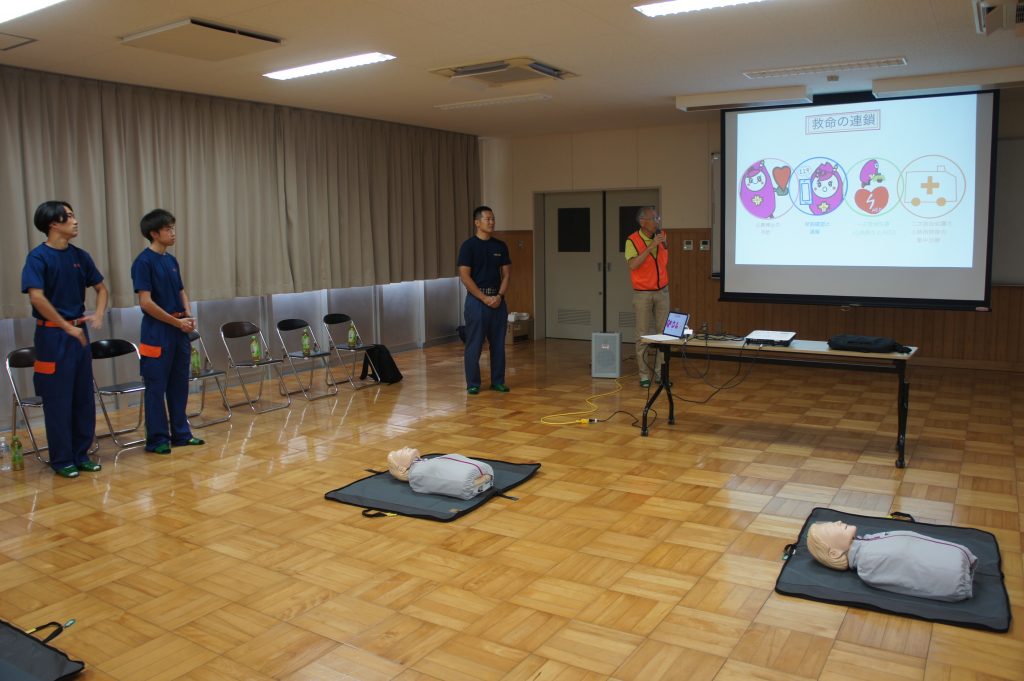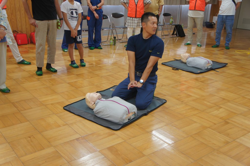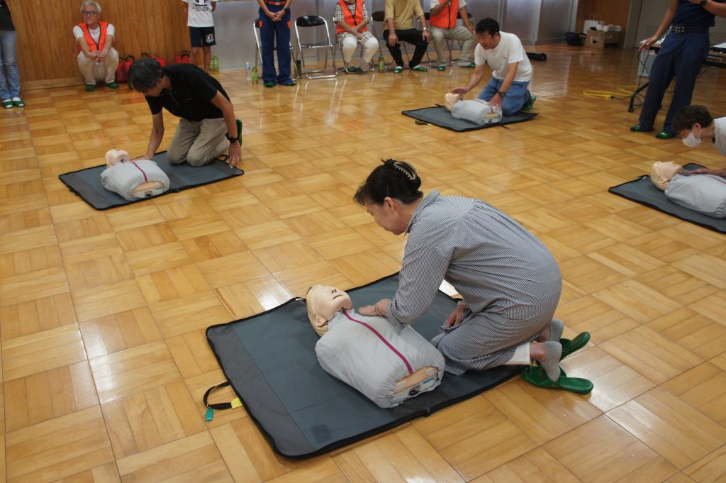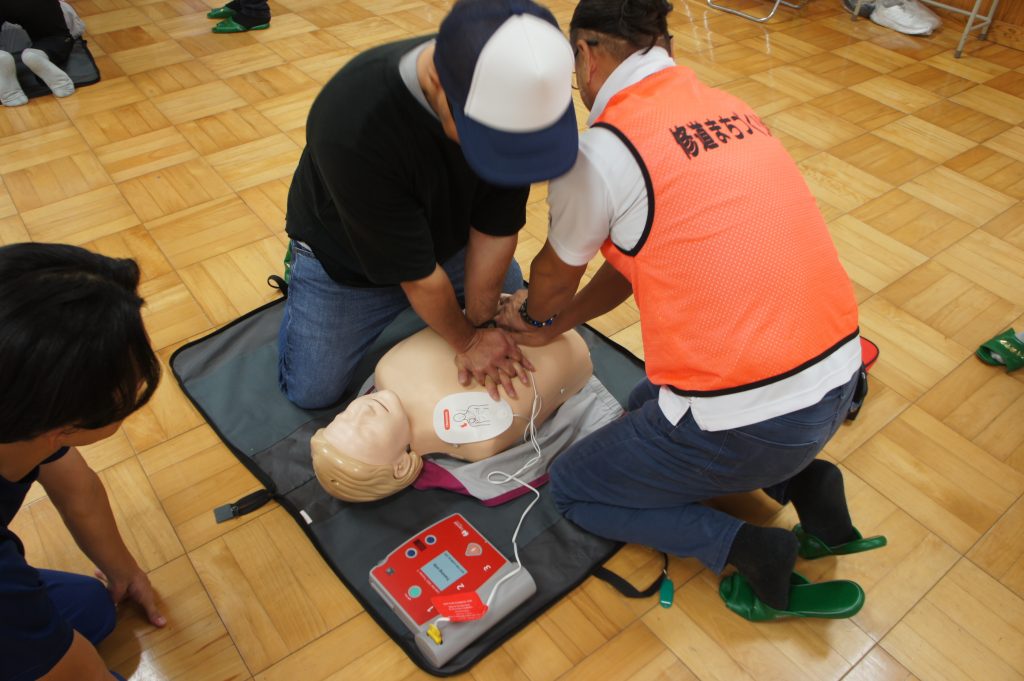 実習では、AEDキットを用いた心肺蘇生の指導の後、参加者一人ひとりが人形を使って実践しました。