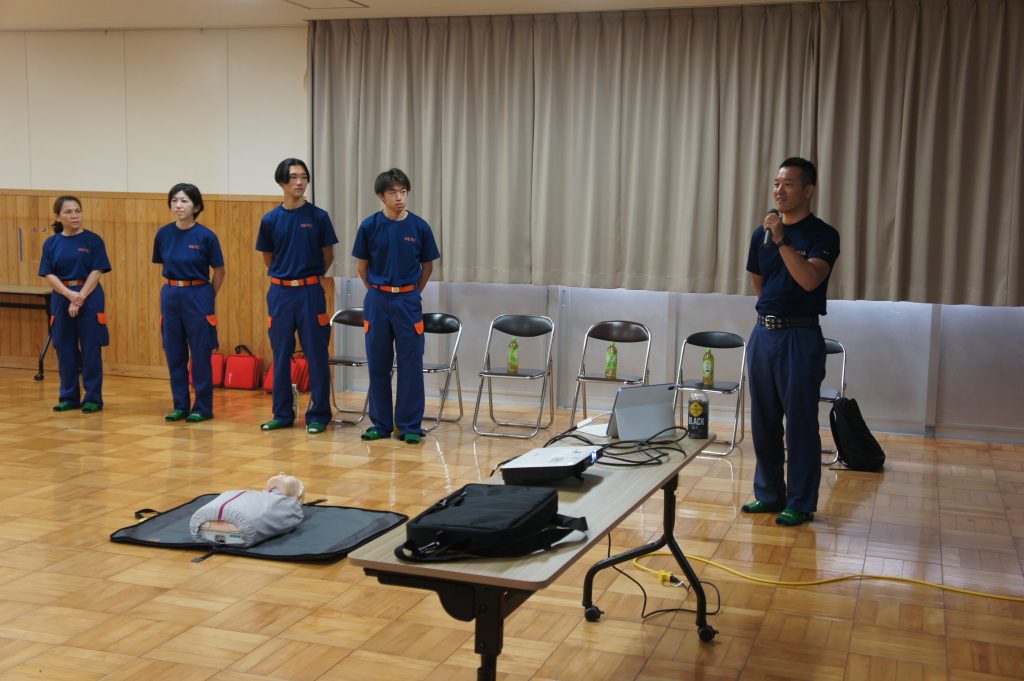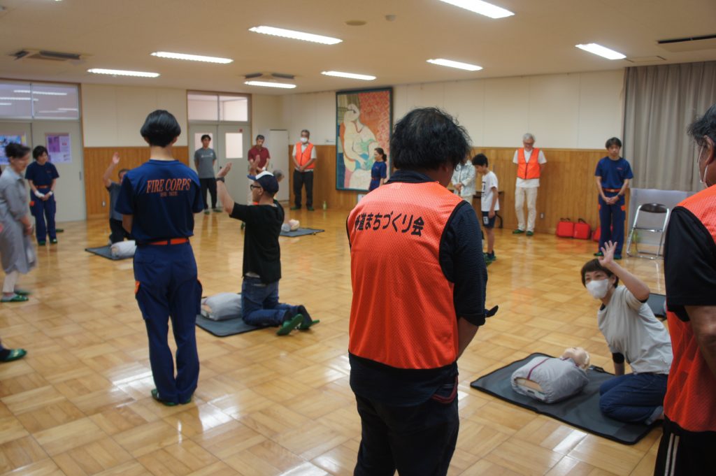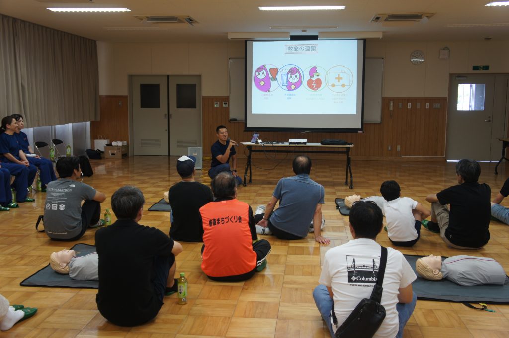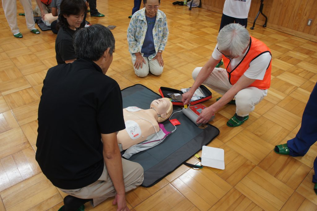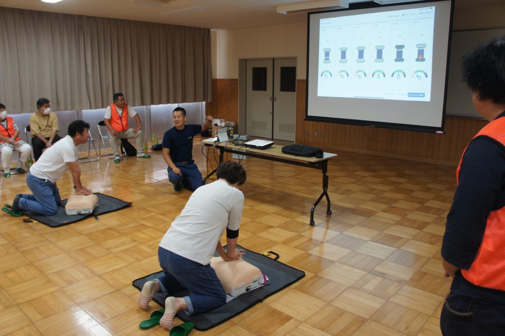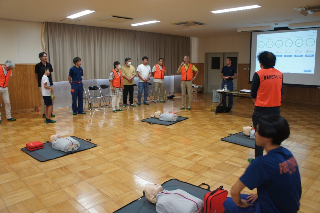 参加者は各自治会の代表24名で、講義と実習を通じて、心肺蘇生やAEDの使用方法を学びました。