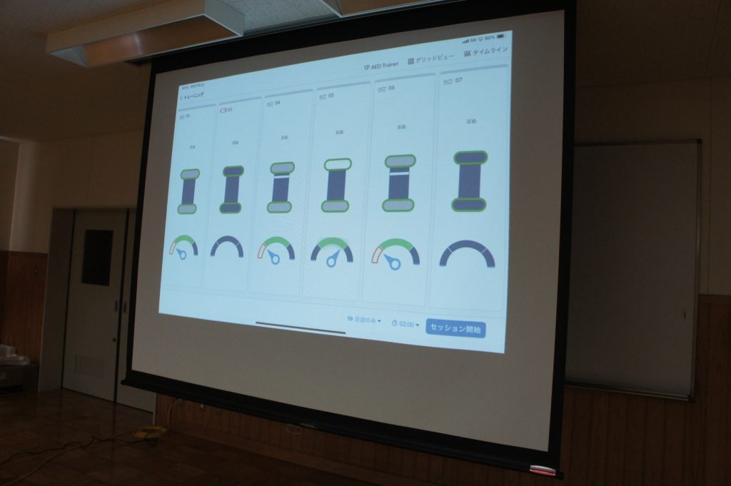 今回は、人形と連動したアプリがスクリーンに映し出され、心臓マッサージの強さやテンポがリアルタイムで表示される最新の実習用キットが使用されました。実習後には得点も表示され、参加者はゲーム感覚で楽しく学ぶことができました。