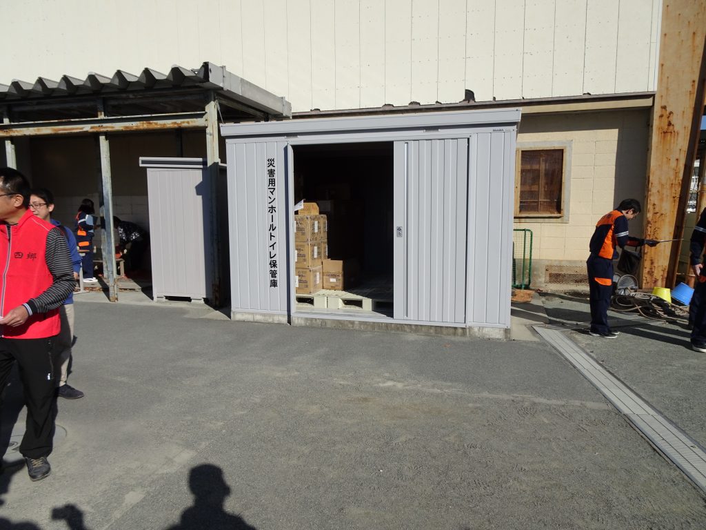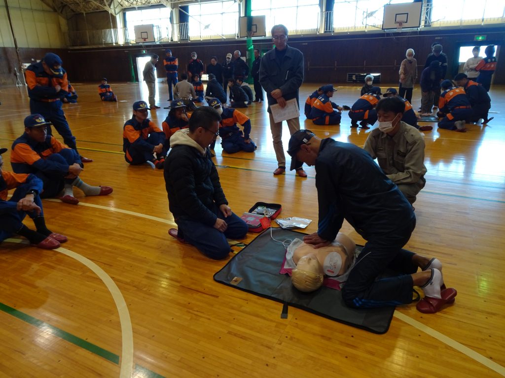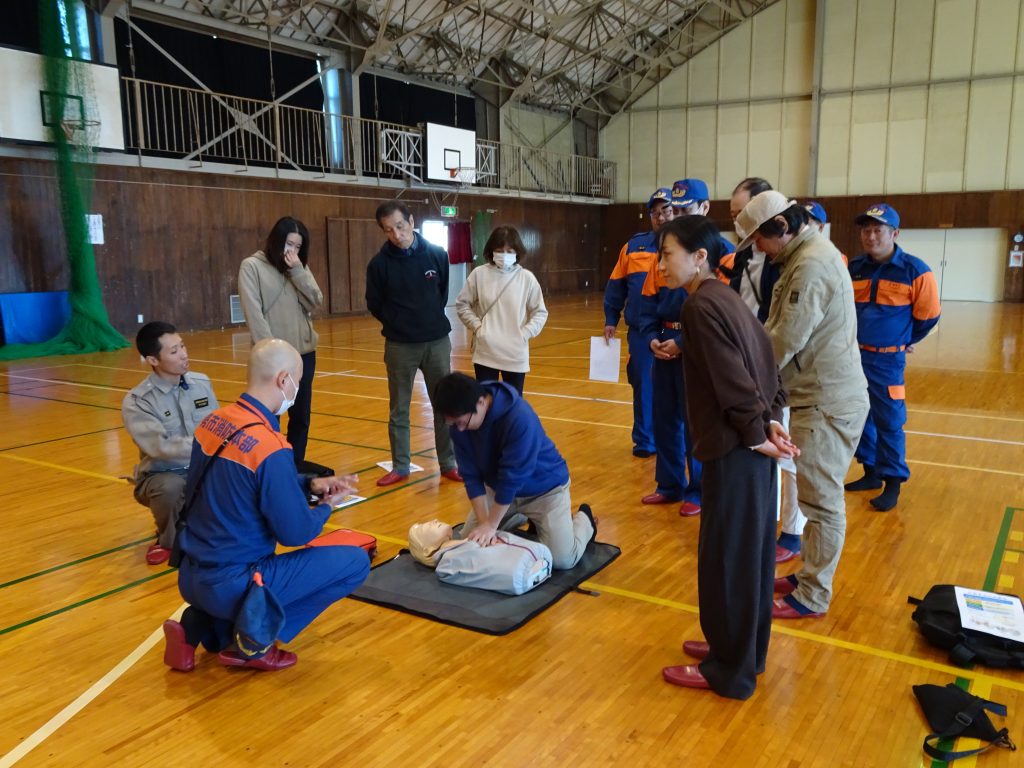 四郷まち協(24名)、修道まち協(34名)、進修まち協(19名)、消防(19名)、市関係(5名)の参加で行われ、五十鈴中学校内の備蓄倉庫、防災物品及び避難所の説明、マンホールトイレの設置訓練、AEDの取り扱い・心肺蘇生の訓練が行われました。