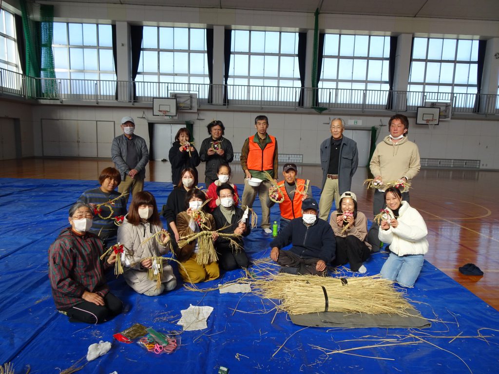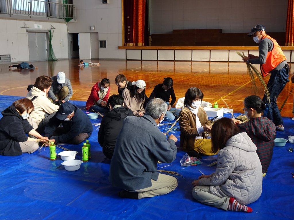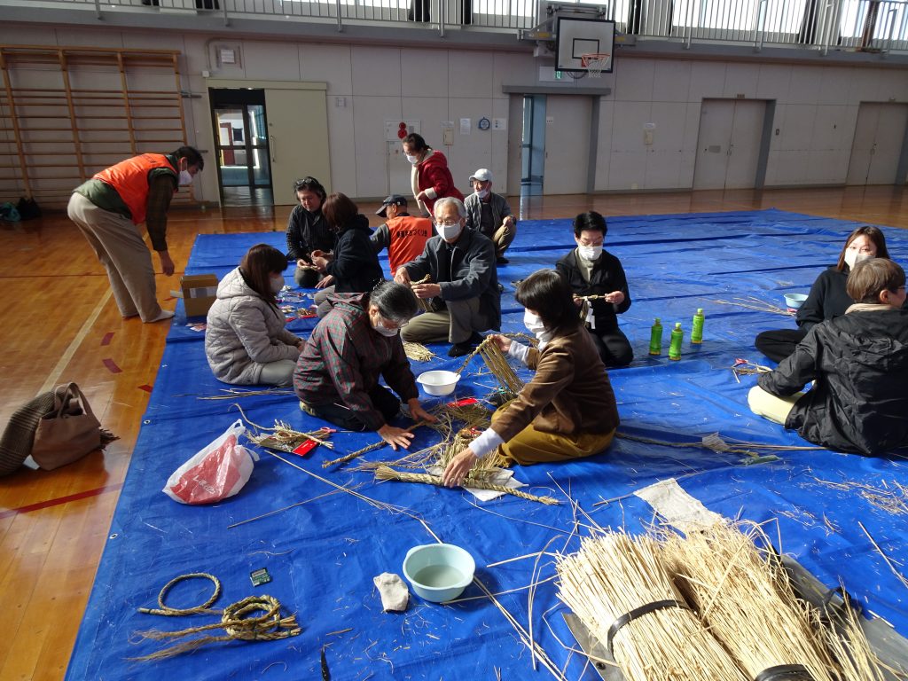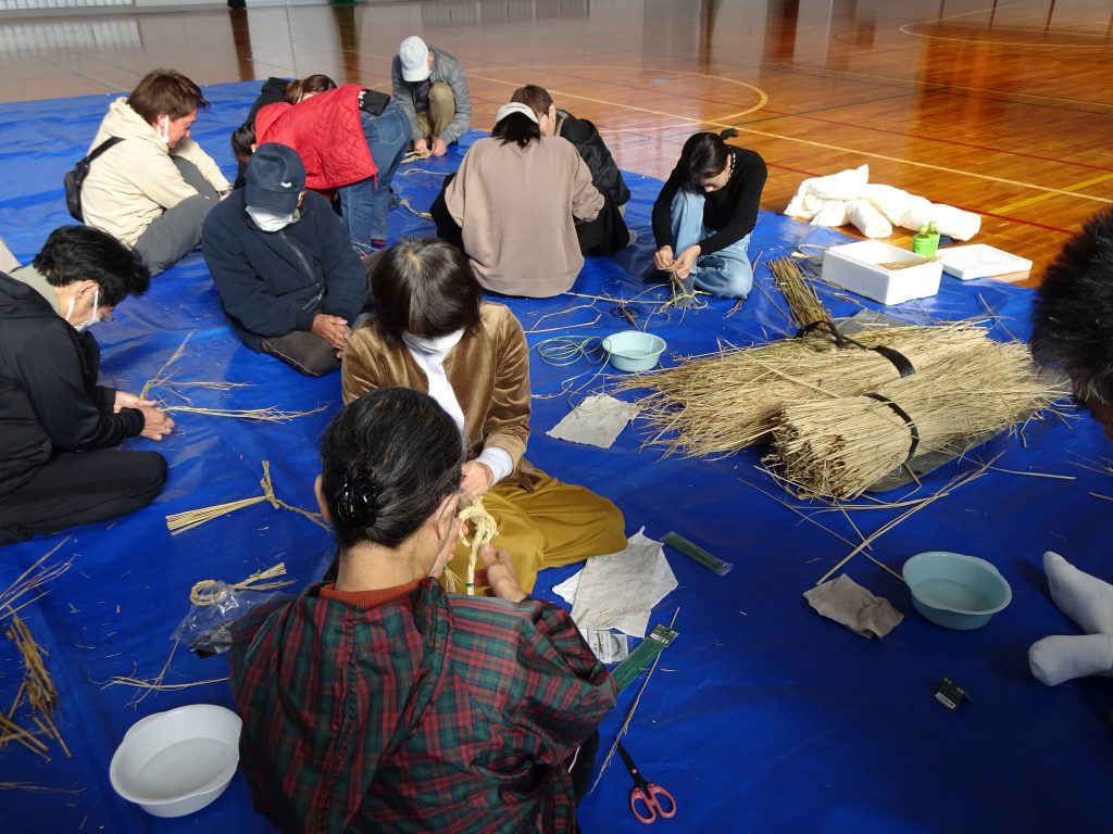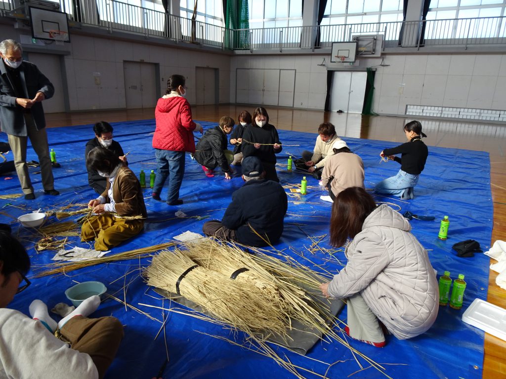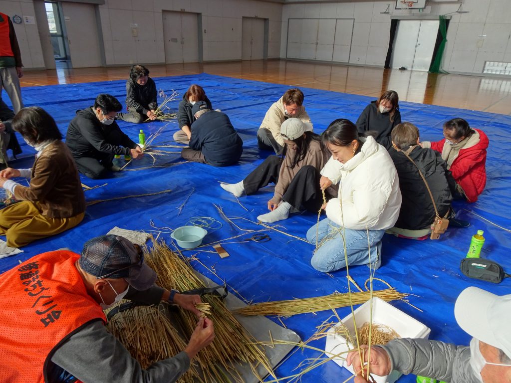 令和7年11月30日(土)に修道小学校体育館にて、今回、初めて取り組みとなる「しめ縄づくり」を農家の方を講師に迎え、わらから編み込んで縄の形にし、リース型、しめ縄型へと展開させていき、苦労をしながら作品にたどり着きました。